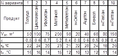 2.2. Определить объем местных зон ВОК, которые образуются вблизи дыхательного устройства емкости, расположенной в цехе, в течение суток за счет больших и малых “дыханий”. Вид продукта, геометрический объем емкости Vап, степень ее заполнения ε и рабочие температуры продукта и воздуха в дневное tд и ночное tн время взять из табл. 2.2. Рабочее давление в емкости – атмосферное (~1*105 Па). Емкость заполняется один раз в конце дневной смены. Таблица 2.2