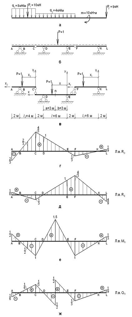На рис. 10, а приведена схема неподвижной нагрузки, необходимая для определения значений реакции и внутренних усилий с помощью линий влияния, а на рис. 10, б – схема движения единичной вертикальной силы Р, равной 1, по балке AL, от которой строятся линии влияния. Затем строим поэтажную схему (рис. 10, в). 5. 1. Построение линий влияния опорных реакций RD и RE. 1) Ставится единичный груз P =1 на балку CF. Начало системы координат (X, Y) принимается на опоре E. Абсцисса груза меняется в пределах – 2 м < х< 8 м, а балки AC и FL мысленно отбрасываются ∑ ME = 0: RD l – P x = 0, откуда RD = P x / l; (1) ∑ MD = 0: –RE l – P(l – x) = 0, откуда RE = P(l – x) / l; (2) При x = – 2 м: RD = – 1/3, RE = 4/3, x = 0 м: RD = 0, RE = 1, x = l м: RD = 1, RE = 0, x = 8 м: RD = 4/3, RE = – 1/3. 2) Единичный груз Р =1 переносится на балку FL. Начало местной системы координат (X 1, Y 1) принимается на опоре K. Абсцисса груза меняется в пределах – 2 м < x 1 < 6 м. ∑ MK = 0: RF l 1 – P x 1 = 0: RF = P x 1 / l 1. Выразим RD и RE через давление RF. Для этого прикладываем давление RF на балку CF в точке F, мысленно отбросив балки AC и FL. ∑ ME = 0: RD l + RF · 2 = 0; RD = –RF · 2 / l = – (P x 1 / l 1 ) · 2 /l; ∑ MD = 0: –RE l + RF · 8 = 0; RE = RF · 8 / l = (P x 1 / l 1 ) · 8 /l. Итак, при движении P = 1 по участку FL реакции равны: RD = – (P x 1 / l 1 ) · 2 /l; (3) RE = (P x 1 / l 1 ) · 8 /l. (4) При x 1 = – 2 м: RD = 1/9, RE = – 4/9, x 1 = 0 м: RD = 0, RE = 0,