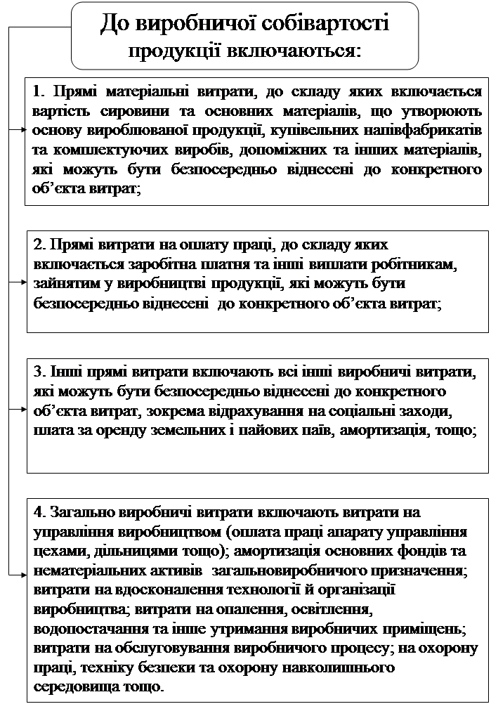 1. Прямі матеріальні витрати, до складу яких включається вартість сировини та основних матеріалів, що утворюють основу вироблюваної продукції, купівельних напівфабрикатів та комплектуючих виробів, допоміжних та інших матеріалів, які можуть бути безпосередньо віднесені до конкретного об’єкта витрат;