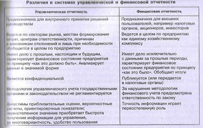 Принятие оперативных решений по управлению финансовыми средствами связано с использованием той системы управленческой отчетности, которая сложилась на данном предприятии. Многие руководители не рассматривают этот аспект работы предприятия как самостоятельный, требующий внедрения наиболее оптимальных форм отчетности, а для контроля и принятия решений используют системы бухгалтерской отчетности, наличие которой требуется от предприятия по закону. Проблема состоит в том, что эти сведения служат специфическим целям и не создают объективной картины работы предприятия. Предпосылкой разделения управленческого и финансового учета на предприятии было создание калькуляционной бухгалтерии. . Калькуляционный учет в то время заключался в составлении предварительных смет: определении затрат на конкретную дату; разработке механизма контроля за издержками и их изменениями; выявлении положительных и отрицательных отклонений от ранее составленных смет; проведении оперативного анализа выявленных отклонений и регулировании издержек производства. Изменившимся производственным отношениям должен был соответствовать новый подход к организации бухгалтерского учета и его составных частей. Прежде всего, видоизменились цели управления, и отсюда изменились требования к калькуляционному учету. Требовалась калькуляция: • по центрам ответственности – для контроля за соблюдением технологических процессов и деятельностью подразделений, в которых они происходят; • по наименованиям изделий – для исчисления полных издержек и цен на изделия; • по видам продукции – для расчета частичных издержек и контроля за инвестициями. Таким образом, разные виды себестоимости необходимы для различных целей управления. Все это привело к созданию системы управленческой отчетности, организованной по децентрализованному принципу. Она имеет существенные отличия от системы финансовой отчетности (табл. 3.1).