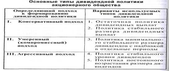 1. Остаточная политика дивидендных выплат предполагает, что фонд выплаты дивидендов образуется после того, как за счет прибыли удовлетворена потребность в формировании собственных финансовых ресурсов, обеспечивающих в полной мере реализацию инвестиционных возможностей предприятия. Если по имеющимся инвестиционным проектам уровень внутренней ставки доходности превышает средневзвешенную стоимость капитала (или другой избранный критерий, например, коэффициент финансовой рентабельности), то основная часть прибыли должна быть направлена на реализацию таких проектов, так как она обеспечит высокий темп роста капитала (отложенного дохода) собственников. Преимуществом политики этого типа является обеспечение высоких темпов развития предприятия, повышение его финансовой устойчивости. Недостаток же этой политики заключается в нестабильности размеров дивидендных выплат, полной непредсказуемости формируемых их размеров в предстоящем периоде и даже отказ от их выплат в период высоких инвестиционных возможностей, что отрицательно сказывается на формировании уровня рыночной цены акций. Такая дивидендная политика используется обычно лишь на ранних стадиях жизненного никла предприятия, связанных с высоким уровнем его инвестиционной активности. 2. Политика стабильного размера дивидендных выплат предполагает выплату неизменной их суммы на протяжении продолжительного периода (при высоких темпах инфляции сумма дивидендных выплат корректируется па индекс инфляции). Преимуществом этой политики является ее надежность, которая создает чувство уверенности у акционеров в неизменности размера текущего дохода вне зависимости от различных обстоятельств, определяет стабильность котировки акций на фондовом рынке. Недостатком же этой политики является ее слабая связь с финансовыми результатами деятельности предприятия, в связи с чем в периоды неблагоприятной конъюнктуры и низкого размера формируемой прибыли инвестиционная деятельность может быть сведена к нулю. Для того, чтобы избежать этих негативных последствий стабильный размер дивидендных выплат устанавливается обычно на относительно низком уровне, что и относит данный тип дивидендной политики к категории консервативной, минимизирующей риск снижения финансовой устойчивости предприятия из-за недостаточных темпов прироста собственного капитала. 3. Политика минимального стабильного размера дивидендов с надбавкой в отдельные периоды (или политика " экстра-дивиденда") по весьма распространенному мнению представляет собой наиболее взвешенный ее тип. Ее преимуществом является стабильная гарантированная выплата дивидендов в минимально предусмотренном размере (как в предыдущем случае) при высокой связи с финансовыми результатами деятельности предприятия, позволяющей увеличивать размер дивидендов в периоды благоприятной хозяйственной конъюнктуры, не снижая при этом уровень инвестиционной активности. Такая дивидендная политика дает наибольший эффект на предприятиях с нестабильным в динамике размером формирования прибыли. Основной недостаток этой политики! заключается в том, что при продолжительной выплате минимальных размеров дивидендов инвестиционная привлекательность акций компании снижается и соответственно падает их рыночная стоимость. 4. Полити