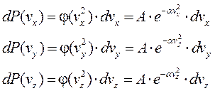 Вероятность того, что скорость молекул попадает в наш объём элемента пространства скоростей, равна произведению вероятностей попадания по осям x, y, z. Поэтому распишем: