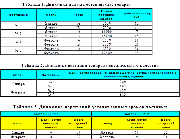 Динамика цен на поставляемую аналогичную продукцию, динамика поставки товаров ненадлежащего качества, а также динамика нарушений поставщиками установленных сроков поставки приведены в таблицах 1, 2, 3.