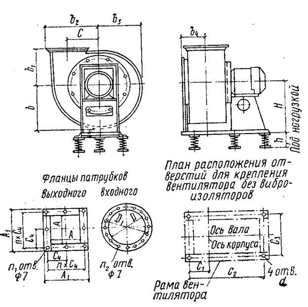 В нашем случае расчетный участок один, потери давления происходят на различного рода поворотах и при присоединении к вентилятору через конфузор. Потери давления на местные сопротивления: 1. Конфузор(переходом): α =100 при соотношении L/dЭν свыше 0, 6 z =0, 1 2. Отвод из звеньев круглого сечения (нормаль серии АЗ-187), два поворота на 900 z = 0, 4 Тогда: å z = 0, 1 + 0, 4*2 = 0, 9 Z = 0, 9 * 18, 73 = 16, 85 (кгс/м2) р = 1, 97 * 9, 2 + 16, 85 = 34, 97 (кгс/м2) Принимая запас на неучтенные потери 10%, получаем; р = 34, 97 * 1, 1 = 38, 47 (кгс/м2); Lотс. = 1600 * 1, 1 = 1760 (м3/ч) 2.2.3 Подбор вентилятора Исходя из полученных данных подбираем вентилятор. Вентиляторный агрегат (А2, 5095-2) типа Ц4-70 № 2, 5 (с промежуточными диаметрами колес) с колесом 0, 95 Dном., числом оборотов по первой характеристике (n = 2800 об/мин) и электродвигателем Ny = 0, 27 кВт.