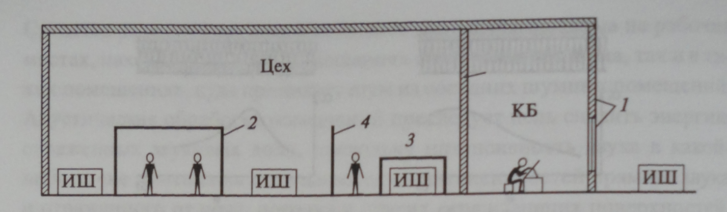Рисунок 1.1 – Средства звукоизоляции. Звукоизолирующие ограждения – это стены, перекрытия, перегородки, проемы, окна, двери. Звукоизоляция ограждений тем выше, чем большей массой (1м2 ограждения) они обладают, так увеличение массы в два раза приводит к повышению звукоизоляции на 6дБ. Для одного и того же ограждения звукоизоляция возрастает с увеличением частоты, т.е.на высоких частотах эффект от установки ограждения будет значительно выше, чем на низких. Для облегчения ограждающих конструкций без уменьшения их звукоизоляции применяются многослойные ограждения, чаще всего двойные, состоящие из двух однослойных ограждений, соединенных между собой упругими связями: воздушным слоем, звукопоглощающим материалом или ребрами жесткости, шпильками и другими конструктивными элементами. Эффективным, простым и дешевым методом снижения шума на рабочих местах является применение звукоизолирующих кожухов. Для получения максимальной эффективности кожухи должны полностью закрывать оборудование, механизм и т.д. Конструктивно кожухи выполняются съемными, раздвижными или капотного типа, сплошными герметичными или неоднородной конструкции – со смотровыми окнами, открывающимися дверцами, проемами для ввода коммуникаций и циркуляции воздуха. Кожухи изготавливают обычно из листовых несгораемых или трудносгораемых материалов (сталь, дюралюминий). Внутренние поверхности стенок кожухов обязательно облицовывают звукопоглощающим материалом, а сам кожух изолирован от вибрации основания. С наружной стороны на кожух наносят слой вибродемпфирующего материала дляуменьшения передачи вибрации от машины на кожух. Если защищаемое оборудование выделяет теплоту, то кожухи снабжают вентиляционными устройствами с глушителями. Для защиты от непосредственного, прямого воздействия шума используют экраны и выгородки (соединенные отдельные секции-экраны). Акустический эффект экрана основан на образовании за ним области тени, куца звуковые волны проникают лишь частично. При низких частотах (менее 300 Гц) экраны малоэффективны, т.к. за счет дифракции звук их легко огибает. Важно также, чтобы расстояние от ИШ до приемника было как можно меньше. Наиболее часто применяются экраны плоской и П-образной формы. Изготавливают экраны из сплошных твердых листов (металлических) толщиной 1, 5-2 мм с обязательной облицовкой звукопоглощающими материалами поверхности, обращенной к ИШ, а в ряде случаев и с противоположной стороны. Звукоизолирующие кабины используют для размещения в них пультов дистанционного управления или рабочих мест в шумных помещениях. Используя звукоизолирующие кабины, можно обеспечить практически любое требуемое снижение шума. Обычно кабины изготавливают из кирпича, бетона и других подобных материалов, а также сборными из металлических панелей (стальных или из дюралюминия). Для уменьшения шума различных аэрогазодинамических установок и устройств применяются глушители. Например, во время рабочего цикла ряда установок (компрессоров, двигателей внутреннего сгорания, турбин и др.) через специальные отверстия происходит истечение отработавших газов в атмосферу и (или) всасывание воздуха из атмосферы, при этом генерируется сильный шум. В этих случаях для снижения шума используют глушители.
