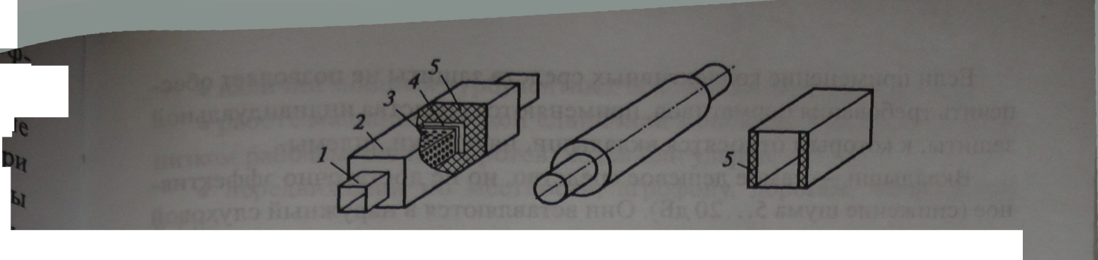 Рисунок 1.2 – Глушители: 1, 2 - трубопроводы различных диаметров; 3 - перфорированная стенка; 4 - стеклоткань; 5 - звукопоглощающий материал. Если применение коллективных средств защиты не позволяет обеспечить требования нормативов, применяются средства индивидуальной защиты, к которым относятся вкладыши, наушники, шлемы. Вкладыши — самое дешевое средство, но не достаточно эффективное (снижение шума 5...20 дБ). Они вставляются в наружный слуховой проход и представляют собой различного рода заглушки из волокнистых материалов, воскообразных мастик, или пластинчатых слепков, изготовленных по конфигурации слухового прохода. Наушники представляют собой чашки из пластмассы или металла, заполненные звукопоглотителем. Для плотности прилегания чашки наушников снабжены специальными уплотняющими кольцами, заполненными воздухом или специальными жидкостями. Степень глушения звука наушниками на высоких частотах составляет 20... 38 дБ. Шлемы используются для защиты от очень сильных шумов (более 120 дБ), так как звуковые колебания воспринимаются не только ухом, но и через кости черепа.