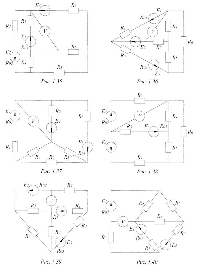 Задание: Для электрической цепи, схема которой изображена на рис. 1.1 – 1.50, по заданным в таблице сопротивлениям и ЭДС, выполнить следующее: · 1. Составить систему уравнений, необходимых для определения токов по первому и второму законам Кирхгофа; · 2. Найти все токи, пользуясь методом контурных токов; · 3. Найти все токи, пользуясь методом узлового напряжения (предварительно упростить схему, заменив треугольник сопротивлений R4, R5 и R6 эквивалентной звездой). Начертить расчётную схему с эквивалентной звездой и показать на ней токи; · 4. Определить ток в резисторе R6 методом эквивалентного генератора; · 5. Определить показания вольтметра и составить баланс мощностей для заданной схемы; · 6. Построить в масштабе потенциальную диаграмму для внешнего контура.