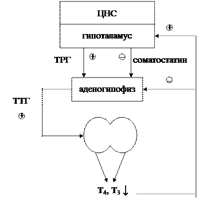 Рис. 13. Схема взаимодействий в гипоталамо-гипофизарно-тиреоидной оси. Условные обозначения как на рис. 5.