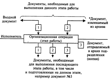 Рис. 1. Схема, иллюстрирующая правила построения организационных процедур Правило 1. Организационная операция (этап работы) на схеме изображается в виде прямоугольника, расположенного в разрезе осевой линии. Правило 2. Наименование подразделения (исполнители), выполняющего организационную операцию, пишется слева над осевой линией. Правило 3. Документы, необходимые для выполнения организационной операции (документ № 1, № 2) изображаются в виде прямоугольников, расположенных в разрезе стрелок, входящих в прямоугольник, изображающий этап работы. Документы, извлекаемые из архива, обозначаются звездочкой (документ № 2). Правило 4. Итог выполнения организационной операции также оформляется в виде документов, расположенных в разрезе стрелок, выходящих из прямоугольника изображающего этапы работы (документы № 1, 2, 3). Правило 5. Если в результате выполнения операции некоторые документы остаются у исполнителя, то они изображаются в виде прямоугольников, расположенных справа под осевой линией (это могут быть документы, отправляемые в архив, например документ № 3). Описание организационной процедуры выполняется по следующей форме. Таблица 1