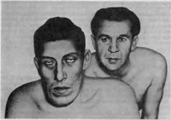 Рис. 76. Акромегалия. Справа — здоровый, слева — больной акромегалией. В связи с этим возможно развитие функциональной недостаточности сердца и печени. Как правило, наблюдается гипергликемия, нередко сахарный диабет; отмечается недоразвитие половых органов (гипогенитализм). нередко бесплодие; психические расстройства — эмоциональная неустойчивость, раздражительность, нарушения сна, снижение умственной работоспособности, психастения. Акромегалия — заболевание, при котором диспропорционально увеличиваются размеры отдельных частей тела (чаще — кистей рук, стоп), черты лица становятся грубыми за счет увеличения нижней челюсти, носа, надбровных дуг, скул (рис. 76). Эти изменения сочетаются с нарушениями жизнедеятельности организма и постепенным развитием полиорганной недостаточности. Синдром преждевременного полового развития — состояние, характеризующееся ускоренным развитием половых желез, появлением вторичных половых признаков, в некоторых случаях — наступлением половой зрелости у девочек до 8-летнего, у мальчиков до 9-летнего возраста, которая, однако, сопровождается психическим недоразвитием. Гипофизарный гиперкортицизм (болезнь Иценко—Кушинга) - возникает при избыточной продукции кортикотропина, что приводит к гиперфункции коркового вещества надпочечников. Клинически болезнь Иценко—Кушинга проявляется ожирением, трофическими изменениями кожи, артериальной гипертензией, развитием кардиомиопатии, остеопороза, нарушением половой функции, гиперпигментацией кожи, психическими нарушениями.