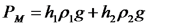Рис. 2.7. Схемы жидкостных манометров Если измеряется давление жидкости в точке М, и соединительная трубка заполнена этой же жидкостью, то следует учитывать высоту расположения манометра над точкой М. Так, избыточное давление в точке М: Чашечный манометр (рис.2.7, б) удобнее описанного выше тем, что при пользовании им необходимо фиксировать положение лишь одного уровня жидкости (при достаточно большом диаметре чашки по сравнению с диаметром трубки уровень жидкости в чашке можно считать неизменным). Для измерения разности давлений в двух точках служат дифференциальные манометры, простейший из которых - U -образный манометр показан на рис.2.7, в. Если при помощи такого манометра, обычно заполняемого ртутью, измерена разность давлений Р1 и Р2 в жидкости плотностью ρ, которая полностью заполняет соединительные трубки, то: