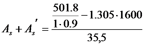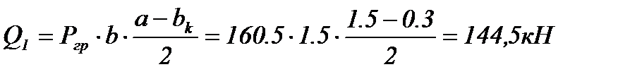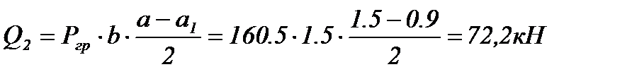 3.4 Прочность фундамента на продавливание по поверхности пирамиды, ограниченной плоскостями, проведенными под углом 45° к боковым граням колонны проверяют по формуле: F £ jb · Rbt · um · h0’ где: F- расчетная продавливающая сила jb = 1- коэффициент, принимаемый для тяжелого бетона um- среднее арифметическое между периметрами верхнего и нижнего основания пирамиды продавливания в пределах полезной высоты фундамента h0 Для фундаментов с квадратной подошвой: um = 2 × (b1 + a1 + 2h01) = 2 × (0, 9+0.9+2·0, 26) = 4, 64 м F = Nр - Pгр·Aос где: Aос = (a1 + 2h0 ) · (b1 + 2h0) - площадь основания пирамиды продавливания Nр = N+ Nф+г = 285.0 + 76, 2 = 361.5 кН Aос = (0, 9+2·0, 26) · (0, 9+2·0, 26) = 2, 016 м2 F = 361.5 – 160.5 · 2, 016= 37.9кН; F =< 0< 1·750·4, 64·0, 26 = 904, 8 кН Вывод: прочность фундамента на продавливание обеспечена. 5. Расчет арматуры фундамента