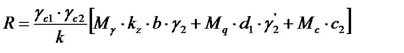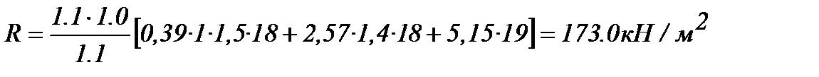 где: gc1; gc2 - коэффициенты условий работы, принимаемые по таблице: gc1 = 1, 1; gc2 = 1, 0 k = 1, 1 так как прочностные характеристики грунта jII и cII приняты по таблицам. Mg, Mq, Mc - коэффициенты принимаемые по таблице 4 Mg = 0.39; Mq = 2.57; Mc = 5.15 kz = 1, так как b=1, 5 м < 10 м gII = gII’ = 18 кН / м3 gII - усредненное расчетное значение удельного веса грунтов, залегающих ниже подошвы фундамента. gII’ - то же, залегающих выше подошвы фундамента. cII(cn) - расчетное значение удельного сцепления грунта, залегающего непосредственно под подошвой фундамента. d1 - глубина заложения подошвы фундаментов