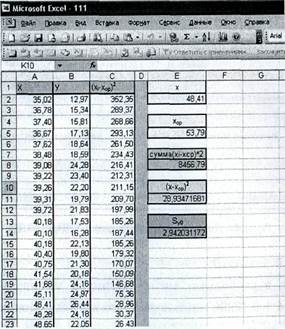 хi - столбец значений независимого признака Х; п- количество наблюдений. Используя стандартные математические операции, а также функции СРЗНАЧ и КОРЕНЬ, производим расчет ошибки по указанной формуле.