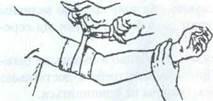 4. Час накладання джгута повинен обов'язково бути відмічений на папірці, який підкладають під джгут. 5. В теплу пору року джгут можна тримати не знімаючи не більше 1 години, а у холодний час і при променевих ураженнях - не більше ніж 30 хв. Загальний час знекровлення не повинен переви-щувати влітку 2 год., взимку - 1 год. 6. Якщо після накладання джгута пройшло більше 1 год., то необхідно послабити джгут для забезпечення живлення кінцівки непошкодженими судинами до появи рожевого кольору кінцівки і відновлення чутливості на 5-10 хв. Роблять це повільно, так щоб потік крові не виштовхнув кров’яний згусток, що з’явився у рані.. Пошкоджену артерію в цей час треба притиснути пальцями вище місця пошкодження. А джгут потім накладають вище того місця, де він був накладений раніше 7. У холодну пору року кінцівку нижче місця накладання джгу-та слід тепло закутати, але не можна застосовувати штучне зігрівання. 8.Використання джгута проводиться лише тоді, коли за допомогою простих і безпечних методів зупинити кровотечу не вдається. Артеріальну кровотечу на ділянці кінцівок можна зупинити сильним згинанням кінцівки в суглобі. Так при пораненнях судин передпліччя, зігнуту в лікті руку із закладеним у ліктьовий згин валиком з тканини (бинта, вати) прибинтовують до плеча, (див. рис. №7).