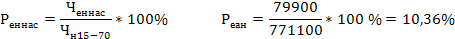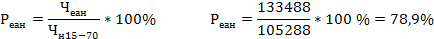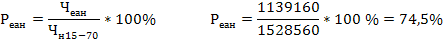 3. Визначаємо чисельність зайнятого населення Чз = 1528560-223000-92600-102800 = 1110160 осіб та рівень зайнятості населення віком з 15 до 70 років