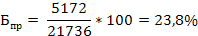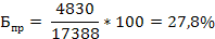 У звітному місяці, в якому був 21 робочий день за графіком, підприємство, котре налічує 828 працівників, через низьку якість продукції мало проблеми з її збутом та завантаженням виробництва й у зв’язку з цим на відпустках з ініціативи адміністрації втратило 4830 людино-днів, проте у звітності цього не відобразило. Який рівень прихованого безробіття був на підприємстві у звітному місяці? Розв’язок. Визначаємо загальний фонд робочого часу (ФРЧ.з.) ФРЧз = 828∗ 21 = 17388 люд.днів Визначаємо рівень прихованого безробіття (Бпр.)