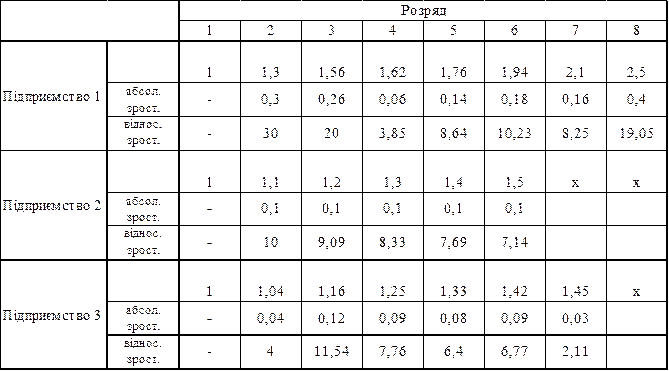 Чому підприємства використовують різну кількість розрядів в сітках? Які чинники могли впливати на розробку кожної з моделей. Розрахуйте абсолютне та відносне зростання тарифних коефіцієнтів на одному з підприємств. Проведіть аналіз тарифної сітки.