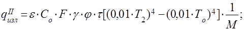 где e – степень черноты излучающего отверстия, определяется по данным прил. 2; Со – коэффициент изучения абсолютно черного тела; Вт/ (м2.к4); F – площадь излучаемой поверхности, м2; F = a. в; а – горизонтальный размер дверцы камеры шкафа, м; в –высота дверцы камеры, м; g – угловой коэффициент излучения, можно принять g = 0, 76; j – количество камер, из технических характеристик оборудования; t – время, в течение которого отверстие (дверца шкафа) открыто, ч; Т2 – абсолютная температура среды камеры шкафа, К; То – абсолютная температура окружающего воздуха, К; М – производительность шкафа, кг/ч.