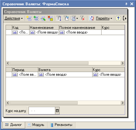 Конструкторы форм Для каждого объекта конфигурации, в составе которого могут находится подчиненные объекты типа " Форма", при добавлении новой формы запускается Конструктор формы. Это специальный мастер, с помощью которого производится выбор типа формы и размещаются реквизиты объекта конфигурации. Несмотря на существенные различия типов объектов, для которых производится создание формы, конструкторы имеют много общего. Рассмотрим работу конструктора на примере конструктора формы справочника. Создадим в каркасной конфигурации форму элемента справочника " Валюты". В окне редактирования объекта справочника " Валюты" на закладке " Формы" в поле для отображения списка форм по кнопке