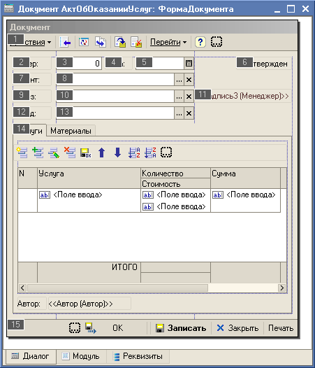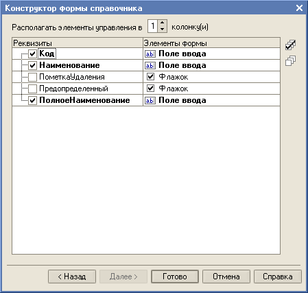 Число форм по каждому типу форм не ограничено. Если у объекта несколько форм одного типа, то одну из них можно выбрать в качестве основной. Для указания основной формы установим флажок " Назначить форму основной". Если выбрана произвольная форма, то основной реквизит не создается - форма имеет типовое поведение. При выборе формы в качестве основной создается основной реквизит и поведение формы отлично от типового. Данные отличия описываются объектами " Расширение формы". Выбор типа формы определяет тип основного реквизита и поведение всей формы, а также возможный состав команд панели инструментов. Нажмем кнопку " Далее" и вставим в форму следующие реквизиты: