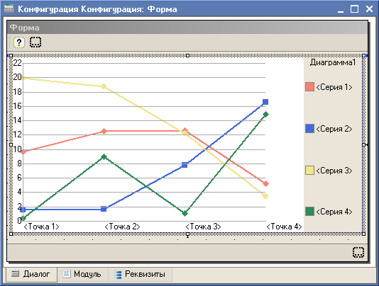 Поле текстового документа - предназначено для размещения текстового редактора в форме. Элементы этого типа не связываются с объектами конфигурации. Разделитель предназначен для организации и управления областями формы. Может перераспределять внутреннее пространство формы, изменяя размеры расположенных в ней элементов управления, привязанных к разделителю. Данный элемент не имеет свойства " Тип данных" и не связан с другими объектами конфигурации. Элемент управления " Поле HTML-документа" предоставляет возможность показа HTML-документа, навигации и редактирования. Режим использования выбирается в свойстве Режим. Если используется режим " Просмотр", то для командной панели, для которой источником действий выступает данное поле, с установленным свойством Автозаполнение, будет определен набор кнопок навигации. Также возможно добавление кнопки Остановить. Для использования данное поле необходимо настроить (например, в процедуре инициализации указать URL ресурса, разместить в форме командную панель, связанную с данным элементом и т.д.). В категории События указываются наименования процедур-обработчиков событий, источником которых является поле HTML-документа. Если используется режим " Редактирование", то в режиме " 1С: Предприятие" в данном поле допускается редактирование HTML-документа. Кнопка - элемент управления, предназначенный для запуска определённой процедуры-обработчика. Кнопка может содержать картинку: Элемент управления " Поле картинки" предназначен для размещения в форме различных картинок. Механизм ссылок позволяет связать с полем картинки некоторые действия, выполняемые при нажатии на нее. Допускается использование " анимированных" типов картинок. В надписях, полях ввода и других элементах управления можно разместить картинки. Кнопки, картинки и надписи могут служить гиперссылками. В этом режиме они реагируют на одинарный щелчок мыши (возникает событие Нажатие). Предопределенные процедуры версии 7.7 теперь называются процедурами-обработчиками событий и в общем случае могут иметь имена, отличающиеся от имен событий. Это относится ко всем процедурам-обработчикам, кроме расположенных в модулях объектов и модулях приложения. Назначение обработчика для события производится в свойствах формы или элемента управления. Свойствами элементов управления можно управлять с помощью встроенного языка. Диаграмма - графическое представление табличных данных. Элемент управления " Диаграмма" можно размещать в форме и табличном документе. Диаграмма представляет собой определенную фигуру или фигуры, которые строятся на основании матрицы данных M х N. Диаграмма состоит из областей: · общая область диаграммы - совокупность всех областей, образующих диаграмму; · область построения диаграммы - содержит координатное пространство и фигуру представления; · заголовок диаграммы; · легенда - вспомогательная область, содержащая список меток, соответствующих сериям. Каждую область можно перемещать внутри диаграммы, изменять ее размер, настраивать или убирать из диаграммы (кроме области построения). При изменении размеров диаграммы размеры областей также меняются пропорционально изменению размеров элемента. Для размещения диаграммы: · в форме - меню " Форма" - " Вставить элемент управления" - выбрать диаграмму; · в табличном документе - м