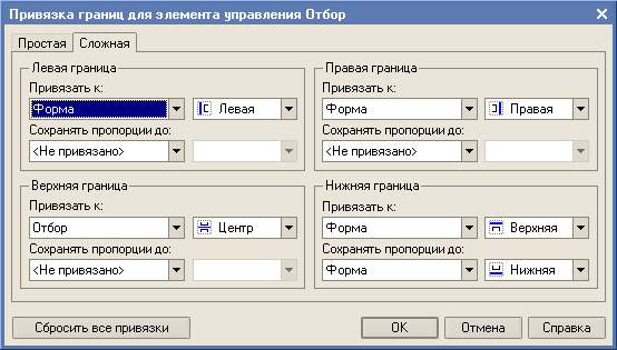 Сводная диаграмма состоит из нескольких областей - области заголовка, области легенды, области построения и областей полей. Все области принадлежат собственно диаграмме. Большинство свойств сводной диаграммы и ее областей совпадают с аналогичными свойствами обычной диаграммы. Задание 5 На форме списка справочник " Заказы" разместите: · табличное поле с отображением табличной части текущего заказа; · список справочника " Клиенты" с отбором по текущему клиенту. Привязки элементов управления В отличие от версии 7.7, когда при масштабировании формы реквизиты диалога неконтролируемо " разбредались" по форме, в версии 8.0 для каждого реквизита диалога формы возможна настройка привязок границ к форме (простая привязка) и к расположенным рядом другим элементам управления (сложная привязка). В диалоговом окне " Привязка границ для элемента управления", вызываемого из палитры свойств элемента управления из категории свойств " Расположение", можно на закладке " Простая" установить простые привязки объекта: · к границам; · к центру; · растягивать; · пропорционально.