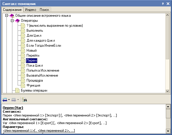 // Индикация массива Для Каждого Элемент из Массив Цикл Сообщить(Элемент); КонецЦикла; Рассмотрим следующий вид операторов - " условия". Условия оформляются следующим образом: Если < ключевое слово > (< логическое выражение>) < ключевое слово> (< логическое выражение>): : ИначеЕсли < ключевое слово> (< логическое выражение>) < ключевое слово> (< логическое выражение>): : Иначе КонецЕсли; В записи условий могут использоваться следующие ключевые слова: " И", " ИЛИ", " НЕ". Ветвей " ИначеЕсли" может быть неограниченное количество или ни одной. Логические выражения имеют тип Булево. При этом, если в условии используется несколько логических выражений, соединенных ключевыми словами " И" или " ИЛИ", и по значению первого логического выражения можно определить значение всего условия, то вычисление значений остальных логических выражений не производится. Например: Значение1 = 5; Значение2 = 4; Если (Значение1 = 5) или (Значение2 = 4) тогда В данном случае в условии используется ключевое слово " ИЛИ". Поэтому, если значение первого логического выражения Истина, то вычисление второго логического выражения произведено не будет. Пример укороченной записи логического выражения: Значение1 = Истина; Значение2 = Ложь; Если Значение1 И НЕ Значение2 тогда Встроенный язык. Инструкции препроцессора Код системы 1С: Предприятие 8.0 может исполняться в файловом, клиентском и серверном окружении, а также в сессии COM-соединения. При этом можно в конфигураторе настроить место выполнения (на сервере или на клиенте) различных процедур и функций для каждого из вариантов. Для указания разрешения использования процедур следует воспользоваться директивой препроцессора. Конструкция типа #Если Сервер тогда : Процедура Проц1() экспорт : КонецПроцедуры : #КонецЕсли позволит указать системе, что процедура Проц1() должна выполняться на сервере, а конструкция #Если Клиент тогда : Процедура Проц2() экспорт : КонецПроцедуры : #КонецЕсли укажет на выполнение Проц2() на клиентской машине. Для включения использования процедур и функций в сессии внешнего соединения применяется инструкция препроцессора #Если ВнешнееСоединение тогда : #КонецЕсли Встроенный язык. Системные перечисления Системные перечисления предназначены для определения некоторого набора предопределенных значений. Доступ к системным перечислениям осуществляется как к свойствам глобального контекста. Конкретные значения указываются через точку от имени системного перечисления. Значения системных перечислений не перебираются по индексу. К системным перечислениям, например, относятся следующие: · КодВозвратаДиалога · РежимБегущейСтроки · ОбходРезультатаЗапроса · РежимПроведенияДокумента · ВариантПериода · и др. Не следует путать системные перечисления и системные наборы значений (например системный набор значений " Символы"). Встроенный язык. Встроенные функции К встроенным функциям языка относятся функции работы со значениями типа дата, строка, число, а также функции преобразования значений и функции форматирования (Формат()).