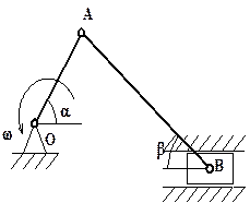 Цель – оценить знания и практические навыки обучаемых по теме «Кинематика» в объеме требуемой программы. Задание: Кривошип ОА, вращаясь вокруг точки О с постоянной угловой скоростью ω, приводит в движение шатун АВ и ползун В. При заданном положении кривошипно-шатунного механизма определить скорость и ускорение шарнира А, угловую скорость звена АВ, скорость и ускорение ползуна В.