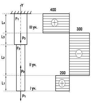 Чертим эпюру перемещений (рис. 1). 4. Полное удлинение стержня (абсолютную деформацию) определяем как сумму удлинений отдельных участков: