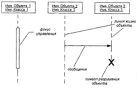 Диаграммы последовательностей действий На диаграмме последовательности изображаются исключительно те объекты, которые непосредственно участвуют во взаимодействии и не показываются возможные статические ассоциации с другими объектами. Для диаграммы последовательности ключевым моментом является именно динамика взаимодействия объектов во времени. При этом диаграмма последовательности имеет как бы два измерения. Одно - слева направо в виде вертикальных линий, каждая из которых изображает линию жизни отдельного объекта, участвующего во взаимодействии. Графически каждый объект изображается прямоугольником и располагается в верхней части своей линии жизни рис.