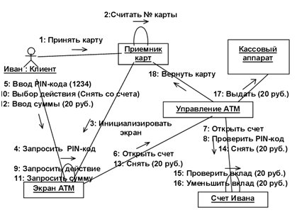 Этот тип диаграмм включает в себя диаграммы Sequence diagram (диаграммы последовательностей действий) и Collaboration diagram (диаграммы сотрудничества). Эти диаграммы позволяют с разных точек зрения рассмотреть взаимодействие объектов в создаваемой системе. Диаграммы сотрудничества Этот тип диаграмм позволяет описать взаимодействия объектов, абстрагируясь от последовательности передачи сообщений. На этом типе диаграмм в компактном виде отражаются все принимаемые и передаваемые сообщения конкретного объекта и типы этих сообщений.