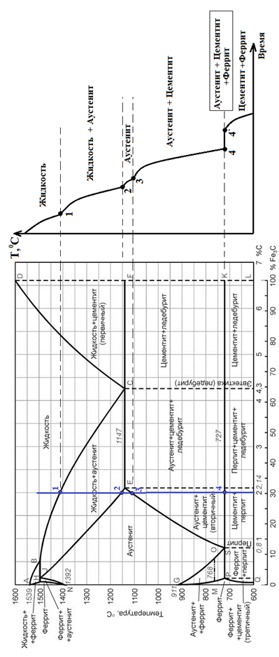 При температуре выше 1400 °С (точка 1) сплав находится в жидком состоянии. В равновесии находится одна фаза-Жидкость. Согласно правилу фаз Гиббса, количество степеней свободы равно С=k-f + 1 =2-1+ 1=2 где k- количество компонентов в сплаве, k=2 (Железо и Цементит) f-количество фаз, f=1 (Жидкость)