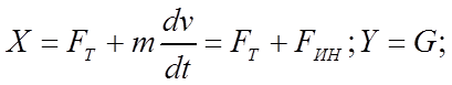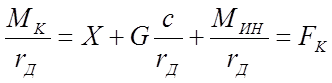 Рисунок 2.16. Схема сил и моментов, действующих на ведущее колесо, оборудованное шиной. При неравномерном относительном вращении колеса около его оси возникает также момент касательных сил инерции При неравномерном переносном движении колеса возникают силы инерции, направленные против движения (при ускоренном движении) и параллельные поверхности пути. Равнодействующая сил инерции Разложим равнодействующую реакций грунта на вертикальную составляющую Yи горизонтальную составляющую X.Вертикальная составляющая Yпредставляет собой сумму элементарных нормальных реакций грунта, а горизонтальная составляющая X - сумму тангенциальных реакций грунта, направленных в сторону движения. Иногда Xназывают толкающей силой или толкающей реакцией. В связи с деформациями почвы и радиальными деформациями шины, происходящими при движении колеса, вертикальная реакция почвы Y смещается относительно оси колеса вперед на некоторое расстояние с. Воспользуемся принципом Д'Аламбера и составим следующие уравнения для плоской модели колеса: