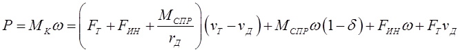 Как было установлено ранее, качение ведущего колеса по грунту всегда сопровождается его буксованием, что характеризуется уменьшением скорости в переносном движении, и действительная скорость движения колеса теоретическая скорость движения, равная произведению угловой скорости на радиус качения (кинематический). С некоторым приближением можно заменить кинематический радиус динамическим. Тогда Имея в виду это обстоятельство, учтем пробуксовку колеса, для чего в уравнение (2.31) добавим и отнимем сумму членов, отражающих переносное поступательное движение, умноженных на действительную поступательную скорость