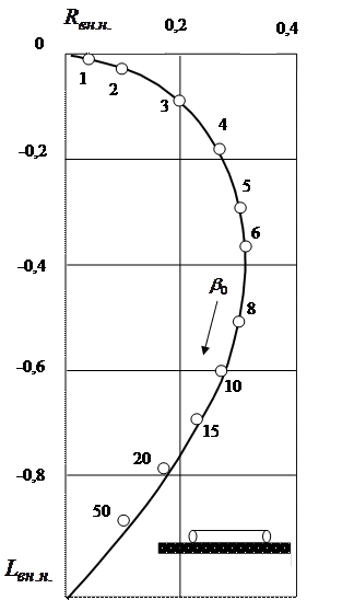 параметра, зазор, сплошность и т. д.) указывают непосредственно на линии графика, которую называют годографом. Для примера на рис. 2 приведен годограф, в относительных величинах описывающий изменение импеданса витка с переменным током, расположенного на поверхности немагнитного проводящего полупространства, при изменении обобщенного параметра 4. МЕТОДИЧЕСКИЕ УКАЗАНИЯ ПО ВЫПОЛНЕНИЮ РАБОТЫ 1. Изучить данное руководство, составить план экспериментов по выполнению лабораторной работы и описать технику их выполнения 2. Изучить работу лабораторного макета вихретокового структуроскопа. 3. Изучить работу макета для двух типов датчиков: накладного и проходного. 4. Отснять годографы для каждого датчика на ферромагнитном и немагнитном образцах. 5. Выбрать наиболее оптимальные по чувствительности режимы и провести измерения с применением накладного датчика на ферромагнитных образцах из углеродистых сталей, закаленных от различных температур. Построить графики в координатах амплитуды ЭДС датчика – коэрцитивная сила и фаза ЭДС датчика – коэрцитивная сила. 4.6. Определить частоту возбуждения накладного датчика для получения отстройки от зазора. Провести измерения на ферромагнитном образце, варьируя зазор от 0 до 2 мм. Рассчитать максимальную погрешность.