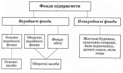 Виробниче підприємство повинне мати засоби виробництва, які є основою продуктивної діяльності підприємства. Вони становлять основний капітал підприємства. Отже, всі матеріально-речові і грошові ресурси, якими володіє підприємство, становлять фонди підприємства. Фонди підприємства поділяють на виробничі і невиробничі (рис. 1.2.1). Виробничі фонди — це ті матеріально-речові засоби, які беруть участь у виробництві. Вони поділяються на основні та оборотні. За допомогою виробничих фондів виробляється продукція, яка становить фонди обігу. Невиробничі фонди — це житлові будинки, спортивні споруди, будинки культури, бази відпочинку, дитячі садки, ясла тощо.