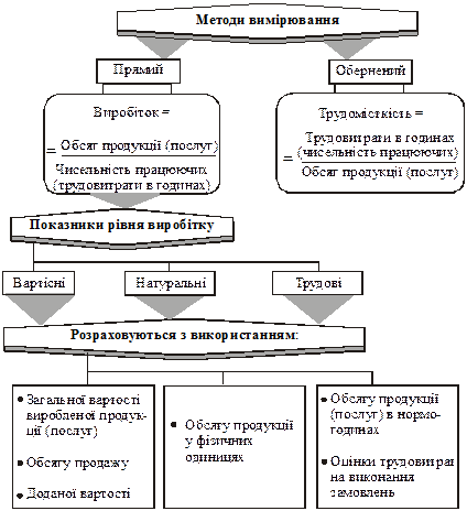 Рисунок 1.3.2 - Методи вимірювання та показники рівня продуктивності праці Виробіток — це кількість виробленої продукції за одиницю часу або кількість продукції, яка припадає на одного середньооблікового працівника або робітника за рік, квартал, місяць. Він вимірюється відношенням кількості виробленої продукції до величини робочого часу, витраченого на його виробництво.
