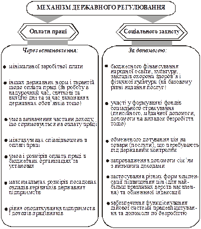 Рисунок 1.4.2 - Складові механізму реалізації соціально-економічної Конкретна реалізація політики заробітної плати здійснюється на підставі договірного регулювання оплати праці найманих працівників підприємств, тобто на підставі укладання системи тарифних угод на трьох рівнях: - міжгалузевому (генеральна тарифна угода); - галузевому (галузева тарифна угода) або комунальному (регіональна тарифна угода); - виробничому (тарифна угода як складова частина колективного договору). Тарифна угода — це договір між представниками сторін переговорів з питань оплати праці та соціальних гарантій. Предметом тарифної угоди як складової частини колективного договору на виробничому рівні є: - форми й системи оплати праці, що застосовуються для різних категорій та груп працівників; - мінімальна тарифна ставка, диференційована за видами (типами) виробництв у межах рівнів, передбачених генеральною тарифною угодою для відповідних видів (типів) виробництв галузі (підгалузі); - розміри тарифних ставок за розрядами робіт і посадових окладів відповідних категорій працівників; - види й розміри доплат, надбавок, премій та інших заохочувальних і компенсаційних виплат та умови їхнього надання; - умови оплати праці за роботу в надурочний час за простої, який мали місце не з вини працівника, за виготовлення продукції, що виявилася бракованою не з вини працівника тощо. У разі найму працівника за контрактом власник або вповноважений ним орган може встановлювати за згодою працівника як передбачені в колективному договорі, так і індивідуальні умови оплати праці. Слід зважити на те, що норми тарифної угоди виробничого рівня можуть тимчасово (до 6 місяців) допускати рівень оплати праці нижчий від норм, визначених генеральною галузевою або регіональною тарифною угодою, але не нижчий від державних норм і гарантій щодо оплати праці. Протягом чинності (строки визначаються сторонами переговорів) тарифних угод ніхто з представників сторін, що перебувають у сфері дії цих угод, односторонньо не може вимагати збільшення (зменшення) розміру оплати праці та пільг понад те, що передбачено тарифною угодою.