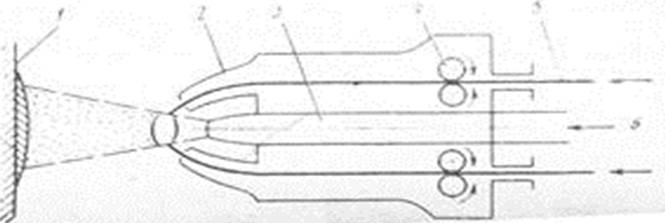 Рисунок 4 - Распылительная головка высокочастотного аппарата для напыления: 1. напыляемая поверхность; 2. газометаллическая струя; 3. концентратор тока; 4. индуктор, охлаждаемый водой; 5. воздушный канал; 6. проволока; 7. подающие ролики; 8. направляющая втулка Детонационное напыление, расплавление металла, его распыление и перенос на поверхность детали достигается за счёт энергии взрыва смеси газов ацетилена и кислорода (см. ниже рисунок 5). При напылении металла в камеру охлаждаемого водой ствола аппарата попадаю в определённом соотношении ацетилен и кислород. Затем в камеру вводится с помощью струи азота напыляемый порошок. Газовую смесь поджигают электрической искрой. Взрывная волна сообщает частичкам порошка высокую скорость полёта, которая на расстоянии 75 мм от среза ствола достигает 800м/с.