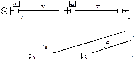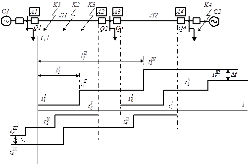 Попередньо приймемо всі захисти спрямованими, тобто вони спрацьовують лише під час спрямування потужності від шин у лінію. Триступеневий захист А1 охоплює повністю лінію Л1 – перший ступінь діє без витримки часу під час к.з. на ділянці лінії Під час к.з. на початку лінії Л1 (точка К1) діє перший ступінь захисту А1 та другий ступінь захисту А2 (А1 вимикає пошкодження без витримки часу, Час спрацювання третіх ступенів вибирається за зустрічно-ступінчастим принципом. Так, третій ступінь захисту А1 узгоджується з третім ступенем захисту А3