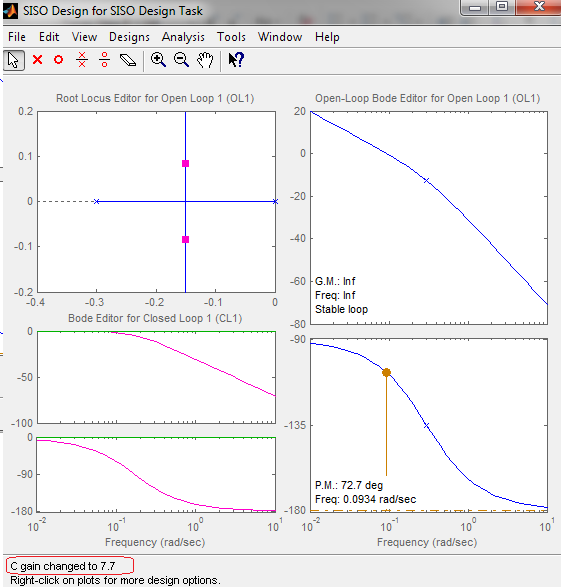 Хід роботи 1. Дані для виконання лабораторної роботи беремо з ЛР№2 згідно варіанту. Задачу формування бажаної ЛАЧХ формулюємо наступним чином: забезпечити максимально широку полосу пропускання (максимальна швидкодія) при відсутності коливань рівня води. 2. В пакеті Matlab задаємо перехідну функцію об’єкта управління висотою води в баку, ввівши в командну строчку 3. Who = tf ([Кho], [Tho 1 0]), та попередньо, регулятора Kph = tf(1). 4. В командний рядок введемо команду Sisotool. 5. Для контролю перерегулювання та тривалості перехідного процесу відкриємо вікно Step Response для LTI Viewer for SISO Design Task. 6. У вікні Open-Loop Bode Editor (рис.3.1) корегуємо ЛАЧХ розімкнутого контуру так, щоб забезпечити максимальну швидкодію при відсутності перерегулювання (рис.3.2).