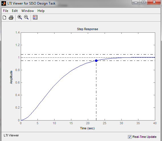 7. Після корекції ЛАЧХ розімкнутого контуру за допомогою додатка Sisotool (рис.3.1, рис.3.2) отримаємо коефіцієнт передачі регулятора рівня води в баку Kph = 7.7 (рис.3.1). На рис.3.2 представлений графік перехідного процесу в системі. Як видно з графіку, час заповнення баку водою до заданого рівня відбувається приблизно за 30-35с. Коливання відсутні. 8. При моделюванні не було враховано, що кут відкриття засувки не може перевищувати Додаємо таку ланку в структурну схему системи, обмежуючи вихід регулятора рівня води в баку Kph, та подивимося, як це позначиться на тривалості перехідного процесу. 9. Структурна схема моделі системи заповнення баку водою з обмежувачем кута повороту заслінки представлена на рис.3.3.