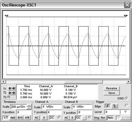 Для исследования интегрирующей RC-цепи необходимы: · функциональный генератор (Function Generator) в режиме синусоидального сигнала с амплитудой 10 вольт и частотой 3 кГц; · резистор (Resistor) номиналом 10 Ом (10 Ohm); · конденсатор (Capacitor) номиналом 10 мкФ (10uF); · осциллограф (Oscilloscope); · заземление (Ground). Резистор и конденсатор находятся в наборе Basics линейки элементов, заземление - в наборе Source, осциллограф и генератор импульсов - на панели приборов Instruments. Каждый элемент имеет точки соединения, которые нужно соединить для получения требуемой схемы. Для наглядности можно переместить элементы внутри рабочей области. При этом соединительные провода будут перемещены автоматически вместе с элементами. При необходимости провода можно также перемещать. Для удобства различения сигналов на экране осциллографа можно изменить цвет соединений, для чего нужно выделить одно из них, нажать правую кнопку мыши и выбрать пункт Color. Когда схема создана и готова к работе, для начала имитации процесса работы необходимо щелкнуть кнопку включения питания на главной панели инструментов. Данное действие приведет в рабочее состояние схему, и в одном из окон строки состояния будет показываться время работы схемы, которое не соответствует реальному и зависит от скорости процессора персонального компьютера. Для просмотра осциллограммы на входе и выходе RC-цепи нужно вывести окно терминала осциллографа двойным нажатием на компоненте Oscilloscope. Прервать моделирование можно двумя способами. Если работа окончена и есть результаты моделирования (рис. 19), то можно повторно щелкнуть переключатель питания. Если же нужно временно прервать работу схемы, например, для детального рассмотрения осциллограммы, а затем продолжить работу, то можно воспользоваться кнопкой Pause, которая также расположена на панели инструментов.