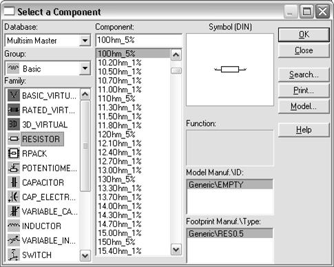 Для того чтобы изменить какие-либо параметры элементов схемы, нужно дважды щелкнуть левой кнопкой мыши на нужном элементе, при этом будет выведено окно свойств элемента (рис. 22). Нажав кнопку Replace, можно выбрать нужный новый резистор, как это показано на рис 23.