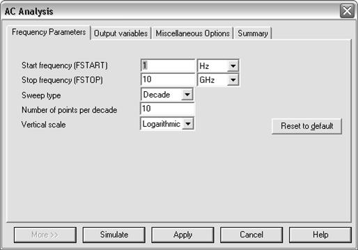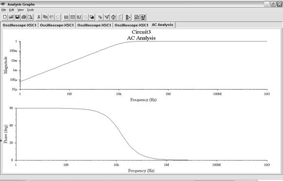 Кроме анализа во временной области, Multisim позволяет выполнять дополнительные виды анализа. В качестве примера для данной схемы можно привести получение АЧХ и ФЧХ RC – цепи. При расчете на вход схемы будет подаваться сигнал различной частоты и производиться расчет амплитуды и фазы выходного сигнала. При этом нужно задать начальную и конечную частоты, на которых будет произведен анализ. Для проведения анализа нужно остановить работу цепи, т. е. воспользоваться переключателем питания и выполнить команду меню Simulate / Analyses / AC Analysis, после чего будет выведено окно параметров анализа (рис. 24). При необходимости можно изменить некоторые из параметров: Start frequency (начальная частота), Stop frequency (конечная частота), Sweep type (тип горизонтальной оси на графике), Number of points per decade (количество точек на декаду), Vertical scale (масштаб по вертикали). Для анализа RC – цепи удобно установить количество исследуемых точек равным 100 для получения более гладкого графика, тип горизонтальной оси – декадами, вертикальной - логарифмический и диапазон частот от 10Гц до 10 КГц.
