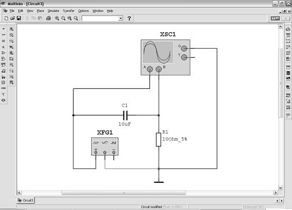 Для моделирования дифференцирующей RC–цепи можно воспользоваться уже готовым файлом схемы интегрирующей цепи, описанной выше. Для этого необходимо загрузить этот файл и поменять расположение в схеме резистора и конденсатора. При этом будет удобно пользоваться командой Rotate (Вращать), которая доступна при нажатии правой кнопкой мыши на соответствующем элементе и передвижением элементов и проводов путем выбора и переноса контактов при нажатой левой клавише мыши. Вид созданной схемы приведен на рис. 27.