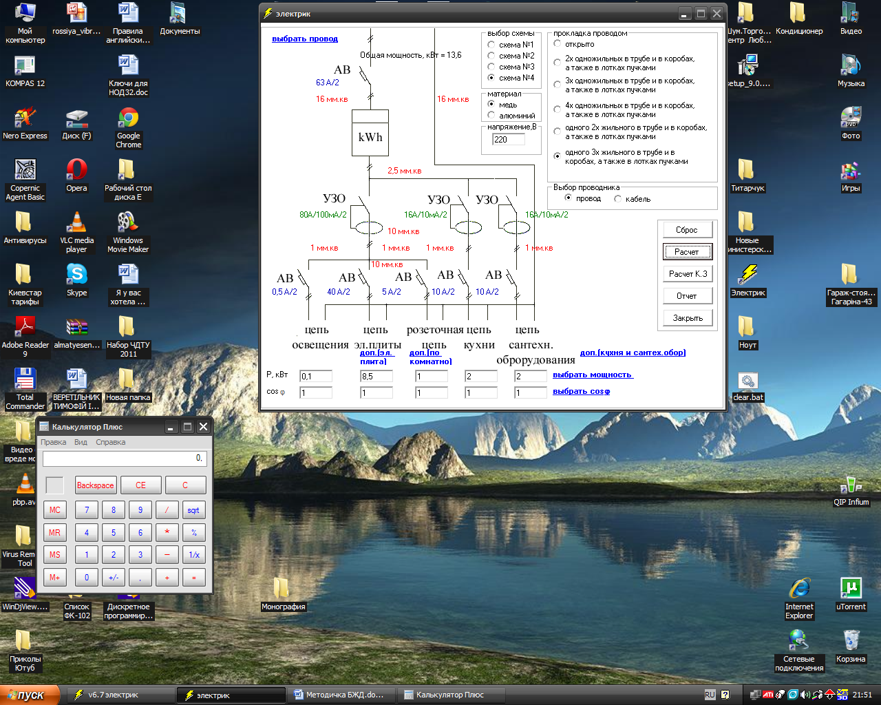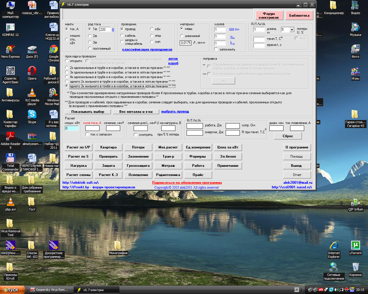 Частина 2 (для технічних спеціальностей) 12. Розрахувати загальну потужність в кВт: «Цепь освещения», «Цепь ел.плиты», «Розеточная цепь», «Цепь кухни», «Цепь сантехнического оборудования» (додаток Б). 13. Встановити і запустити програму «v 7.0 электрик» (безкоштовна програма на російській мові надається викладачем). 14. Вибрати параметри: ü Найти - «Ток». ü Род тока – однофазний 220В. ü Проводник – провод. ü Материал - «Медь». ü Потери – 5%.