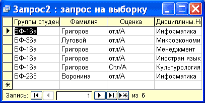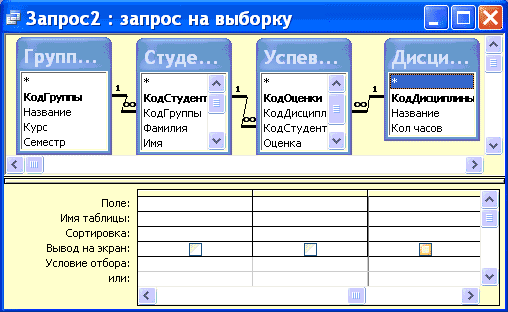Переместить имена полей с источника в Бланк запроса. Например, из таблицы Группы студентов отбуксировать поле Название в первое поле Бланка запросов, из таблицы Студенты отбуксировать поле Фамилии во второе поле Бланка запросов, а из таблицы Успеваемость отбуксировать поле Оценка в третье поле и из таблицы Дисциплины отбуксировать поле Название в четвертое поле Бланка запросов.