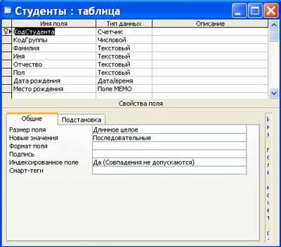 В первую строку колонки Имя поля вводим код студентов (КодСтудента) и нажимаем клавишу Enter, при этом курсор переместится в колонку Тип данных, где из раскрывающегося списка выбираем тип данных - Счетчик. Затем нажимаем клавишу Enter, при этом курсор переместится в колонку Описание, при необходимости вводим описание данных, которые будут вводиться в это поле таблицы.